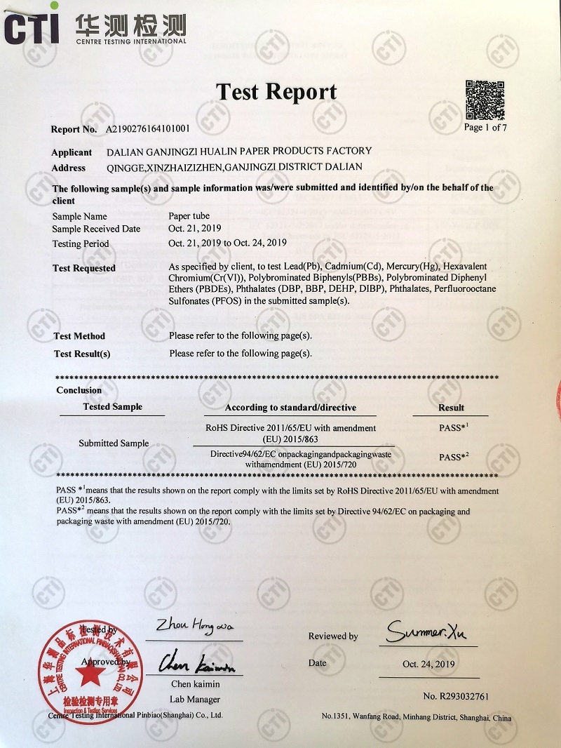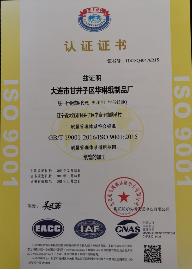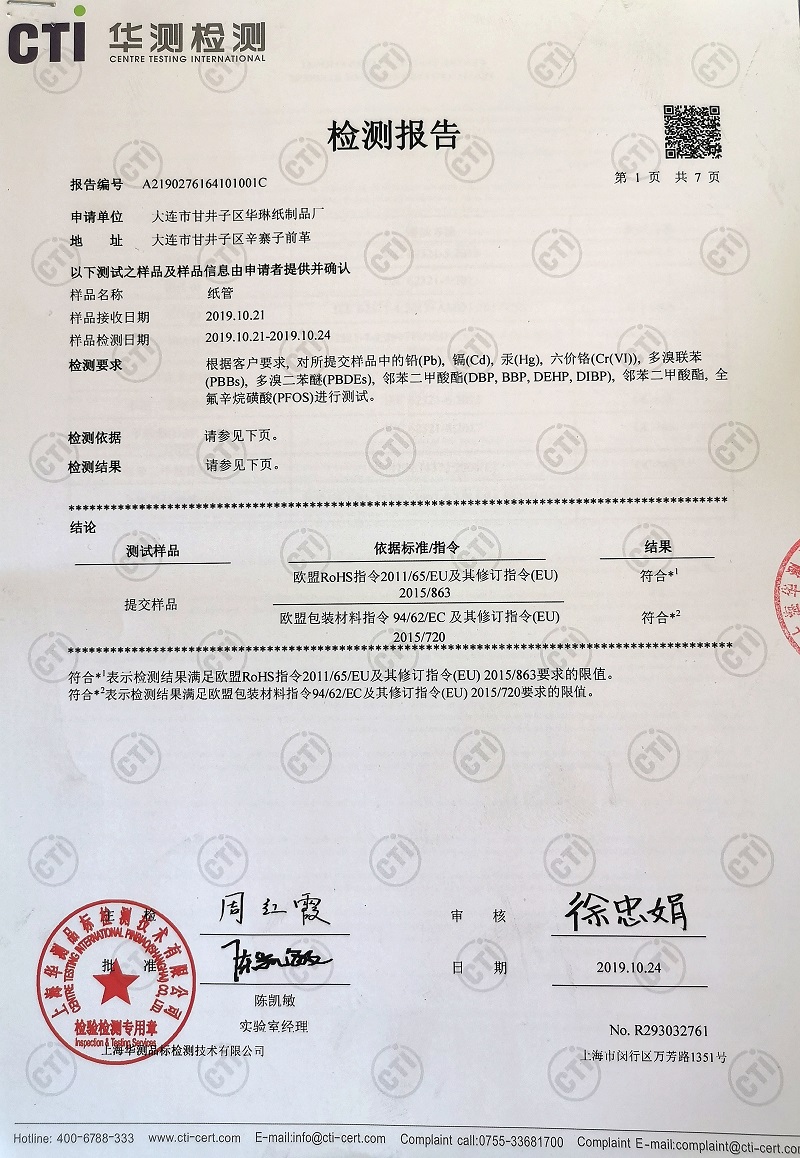 我廠先后通過ISO9001質量管理體系認證和ISO14001環境管理體系認證,各項管理系統完善,符合環保生產要求,達到國際標準。我廠生產的紙管、紙護角通過RoHS和PFOS認證,符合歐盟標準,是可替代木材新型環保包裝制品。